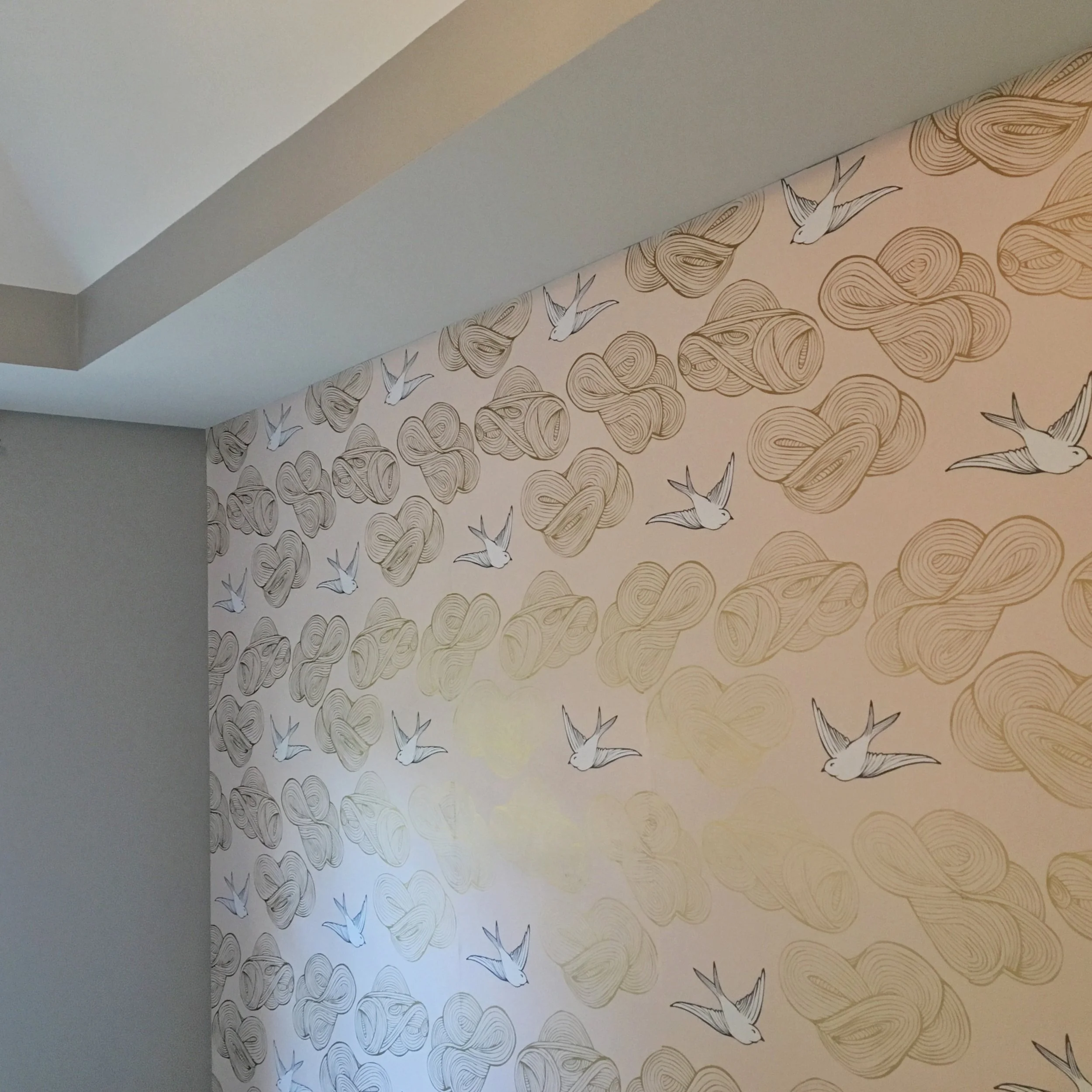 In other news, our headboard is complete... at least the wood structure is complete. It's now time for me to work some DIY magic. I designed the headboard and my amazing client's father constructed it to absolute perfection! We have a gorgeous blush linen planned for the headboard, that will hopefully be the perfect compliment to our wallpaper.