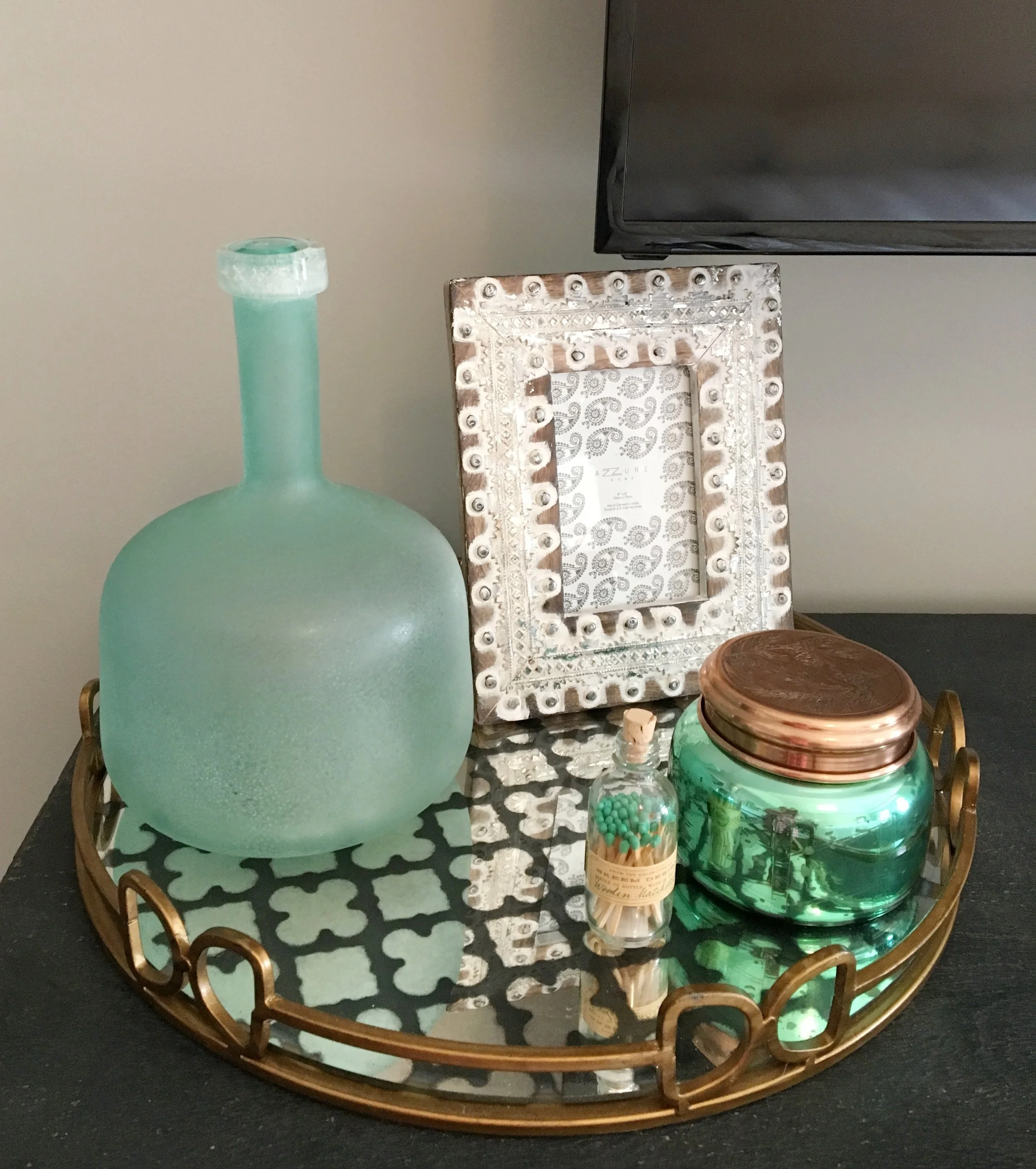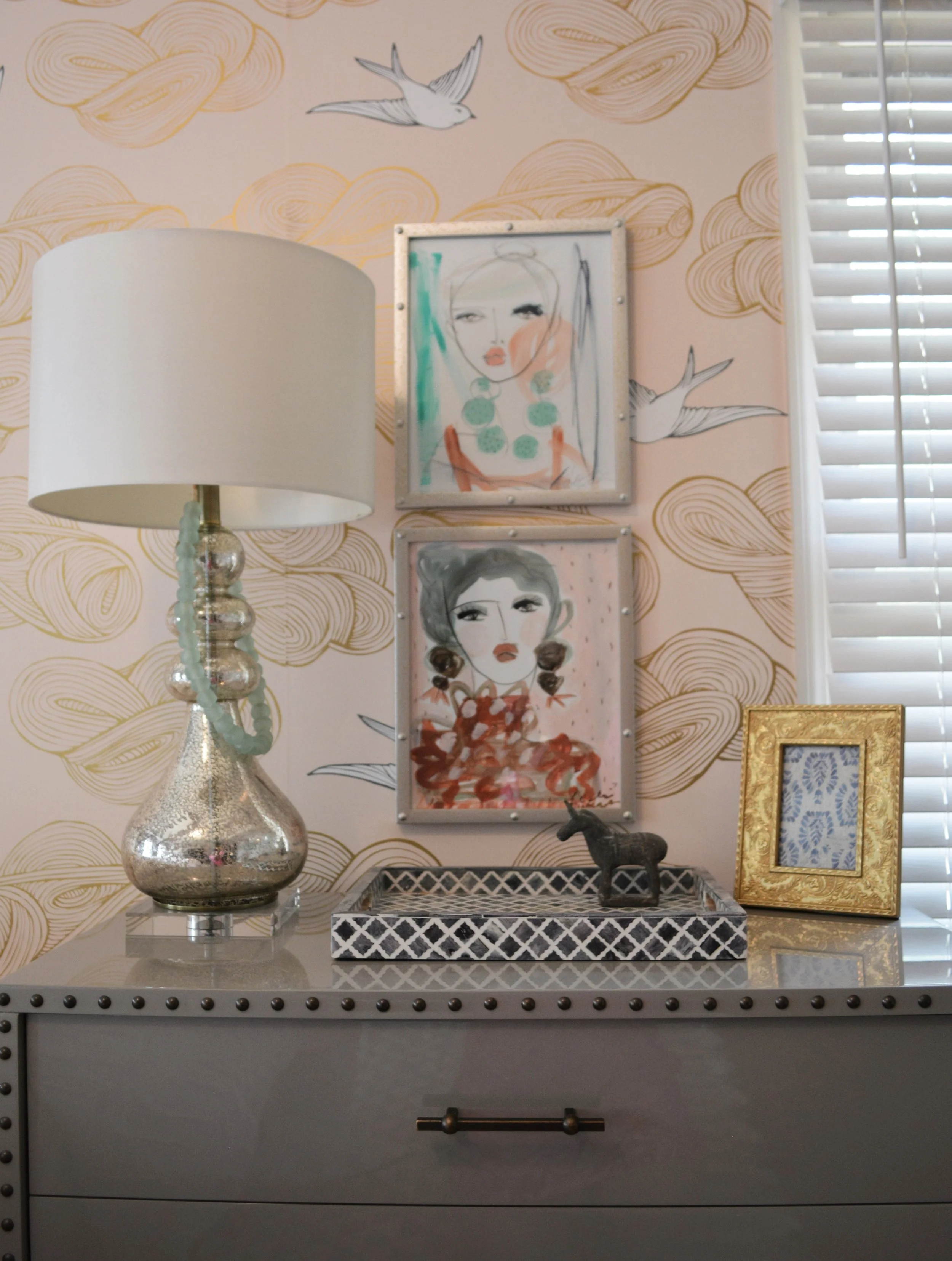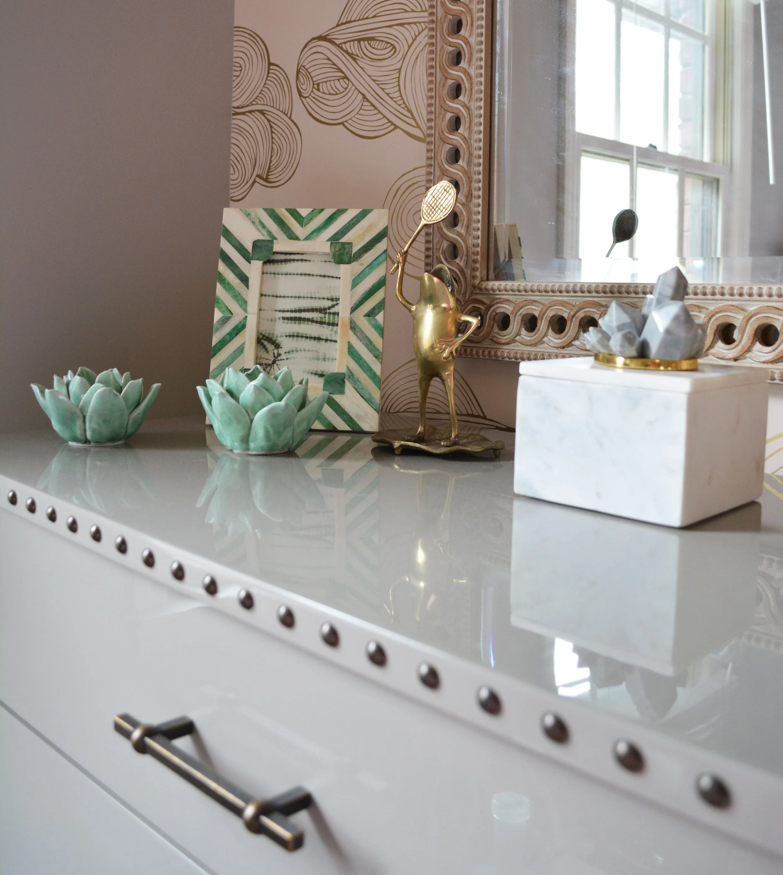 Finally, we were able to accessorize most of the room once the missing dressers from West Elm arrived this week! Accessories are my absolute favorite part of any room, and are really the glue that hold a space together stylistically. We pulled lots of green and turquoise objects from the color pallet of the fabric for our accessories. I also love using brass and mirrored objects, as they create both warmth and light. We are still waiting on our custom lampshades and finials, but it is exciting to get a glimpse of what the finished product will look like!