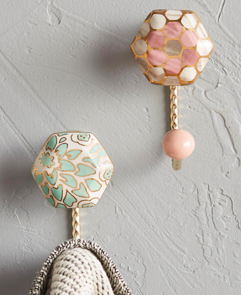 I think pretty things are great, but when it comes to a nursery, functionality is also crucial. I think every room needs multiple good sources of differing light. I love lamps for a nursery because they offer a softer alternative to overhead lighting. The other must have for me is storage. Can you really ever have enough? I'm using these hooks not only because they go great with my design, but my plan is to hang outfits on these hooks to make things easier for my husband when he dresses the baby. He has admitted that accessorizing a little girl is not going to be his strong suit, so these hooks give me the opportunity to set everything out for him!
