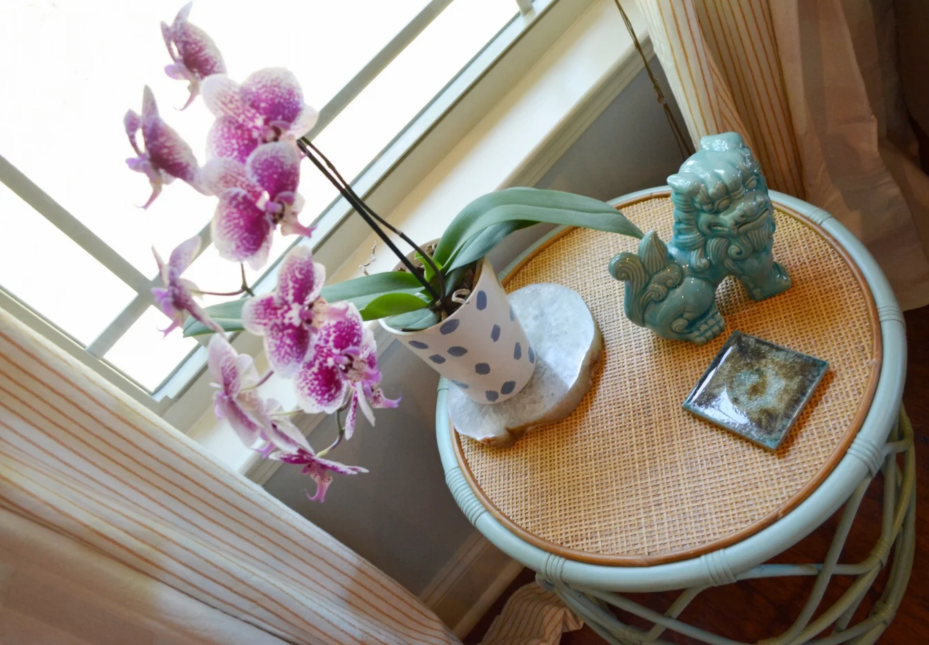Some things in the room stayed like the glider (we have an identical one in Amelia's room right now and it is a current must have) and our beloved acrylic coffee table. Other things got makeovers or reworked. We made a table skirt for the table beside the sofa to give it a new look and sprayed the new rattan table sides for beside the chair to add a little punch. Most of all we wanted this space so represent who we are now as a family. It had to be cozy and kid friendly too. The ginger jars will have to go somewhere higher soon as are little one is becoming increasingly more mobile but I am enjoying displaying them for now! Our goal was to create a layered space that had lots of texture and a collected look. We also loved including lots of family heirlooms and antiques in this space. The artwork is a piece I created especially for the ORC and this space from a photo I took in our yard earlier this year.